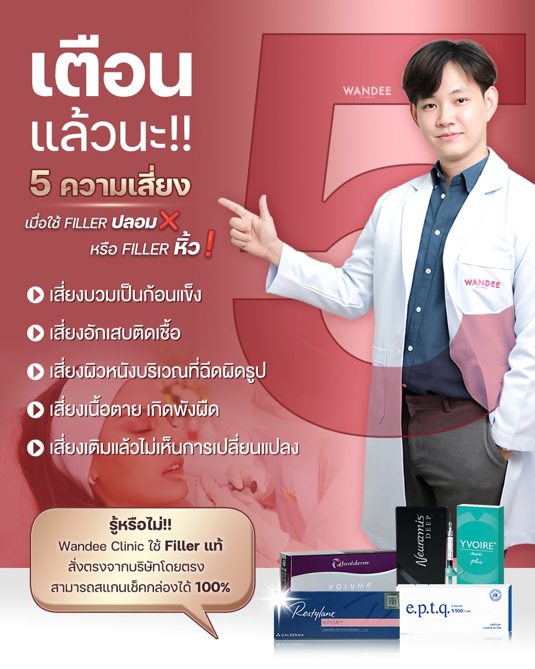 หากอยากเติมเต็มใบหน้าให้ดูเต็ม ดูอ่อนเยาว์ขึ้นอย่างเป็นธรรมชาติ ที่มาพร้อมความปลอดภัย ได้มาตรฐาน สามารถตรวจสอบได้ ต้องที่ Wandee Clinic เพราะเป็นคลินิกความงามที่ได้รับความไว้วางใจจากลูกค้าจำนวนมาก มีทีมแพทย์ผู้เชี่ยวชาญด้านฟิลเลอร์โดยตรง ใช้ผลิตภัณฑ์ที่ผ่าน อย. ไทยทุกแบรนด์ มั่นใจได้ว่า สวย ปลอดภัย ผลลัพธ์ชัดเจนทุกเคสค่ะ