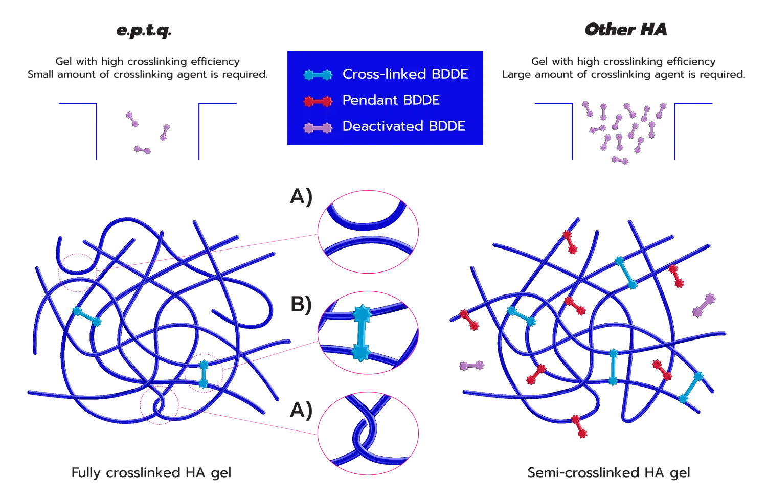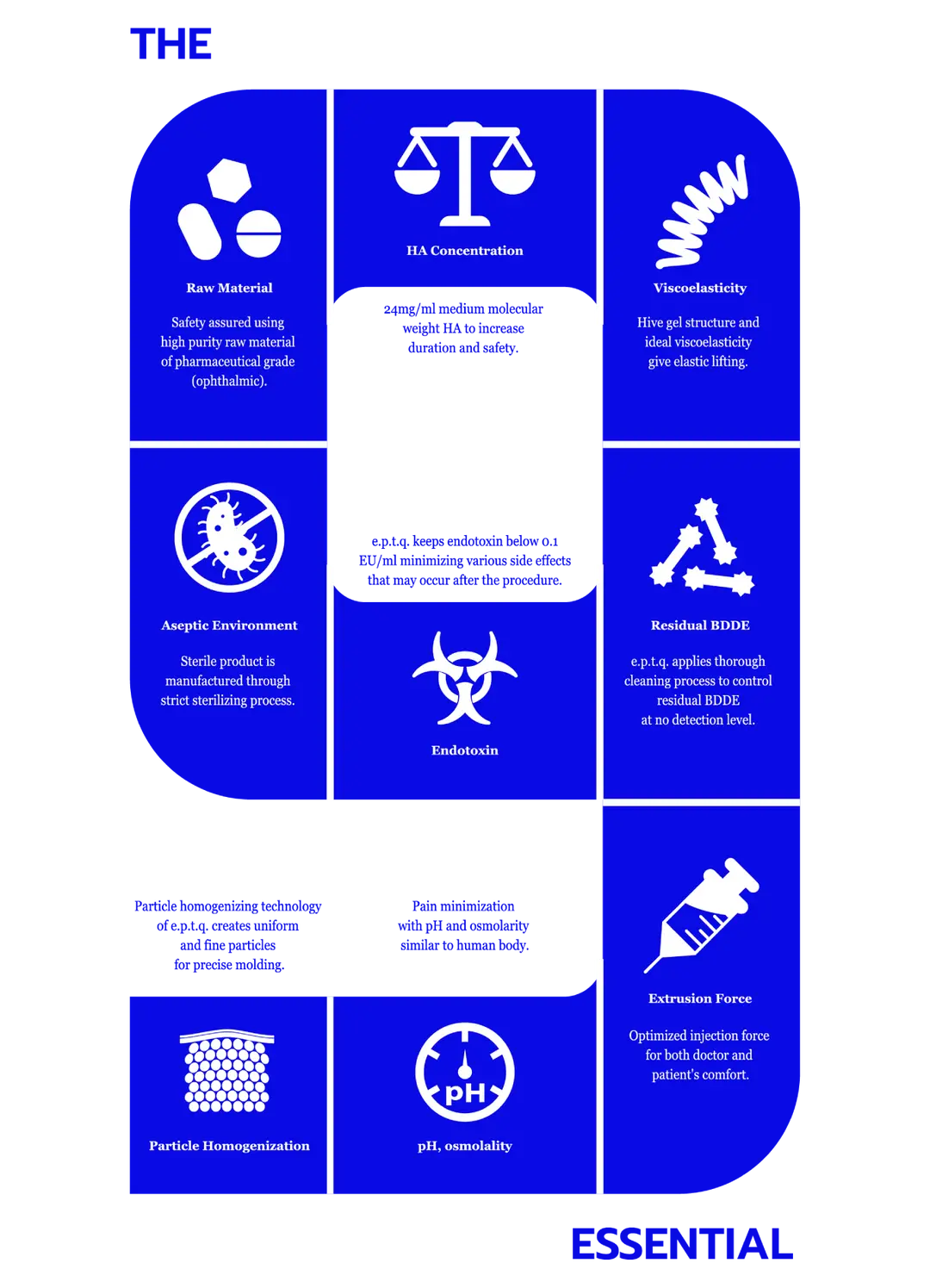 ฟิลเลอร์ e.p.t.q เป็นฟิลเลอร์จากประเทศเกาหลีที่ถูกควบคุมกระบวนการผลิตภายใต้มาตรฐาน The 9 Process และ Downing Process โดยใช้ถึง 2 เทคโนโลยีในการผลิต ได้แก่ เทคโนโลยี ZEEP Technology และเทคโนโลยี 2CM Technology (Two Crosslinking Method) เพื่อเพิ่มโครงสร้างความยืดหยุ่นและความคงตัว ทำให้ได้ฟิลเลอร์ที่มีความปลอดภัยสูง ได้โมเลกุลที่มีความยืดหยุ่นสูง ทั้งยังเพิ่มประสิทธิภาพในการยึดเกาะของโมเลกุลให้แน่นขึ้น และสามารถคงผลลัพธ์ได้นานขึ้นอีกด้วย