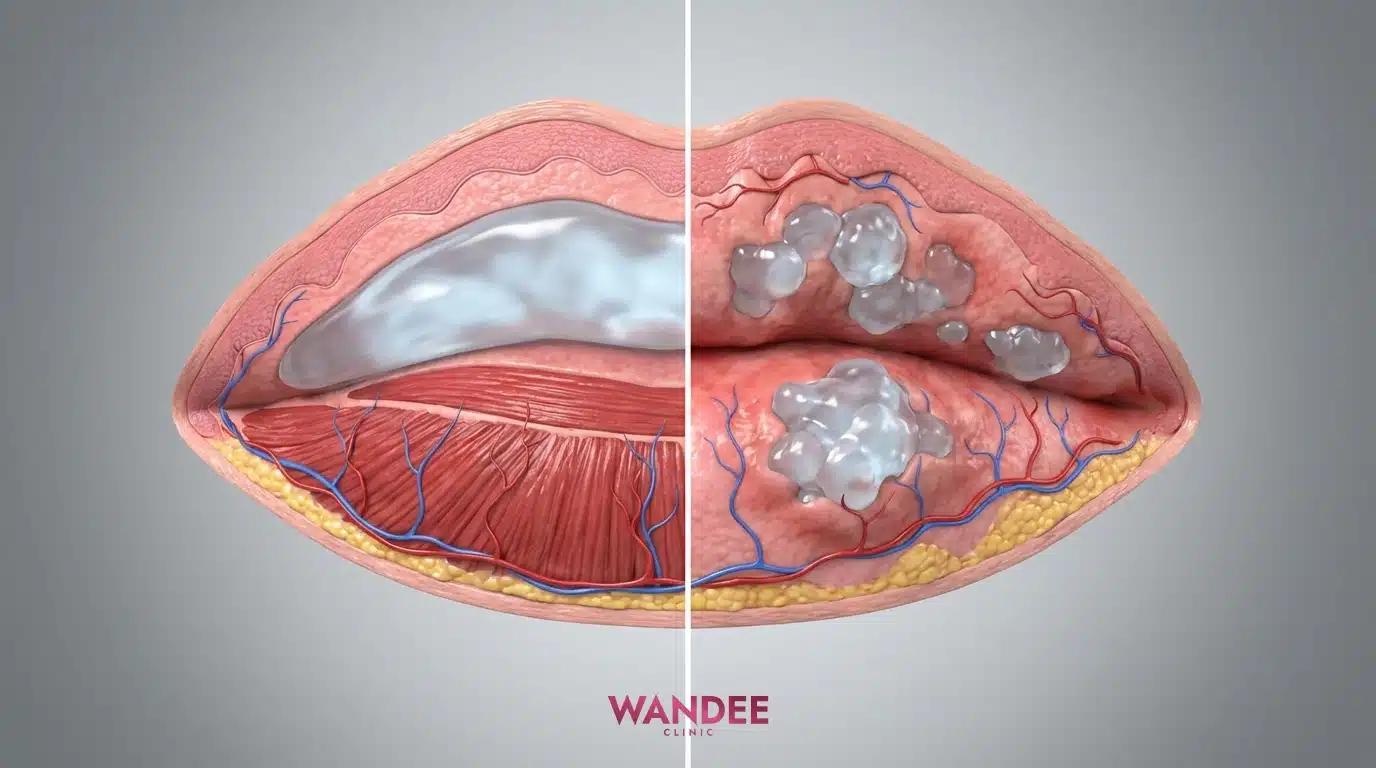 ก้อนหลังทำปากเกิดได้จากหลายสาเหตุ เช่น บวมคั่งในช่วงแรก เจลจับตัวในบางจุด หรือการวางชั้นที่ไม่เหมาะกับเนื้อปาก ก้อนที่เป็นเพียงบวมนิ่มมักค่อย ๆ ดีขึ้นเมื่อยุบ