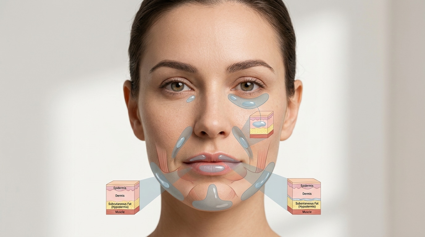 คำอธิบายใต้ภาพ : ภาพสื่อแนวคิดตำแหน่งยอดนิยมในการฉีดฟิลเลอร์ เช่น ใต้ตา ร่องแก้ม ปาก คาง และกรอบหน้า โดยแต่ละตำแหน่งต้องเลือกชนิดเนื้อฟิลเลอร์และชั้นที่วางให้เหมาะกับโครงสร้างใบหน้าเพื่อให้ผลลัพธ์ดูเป็นธรรมชาติ