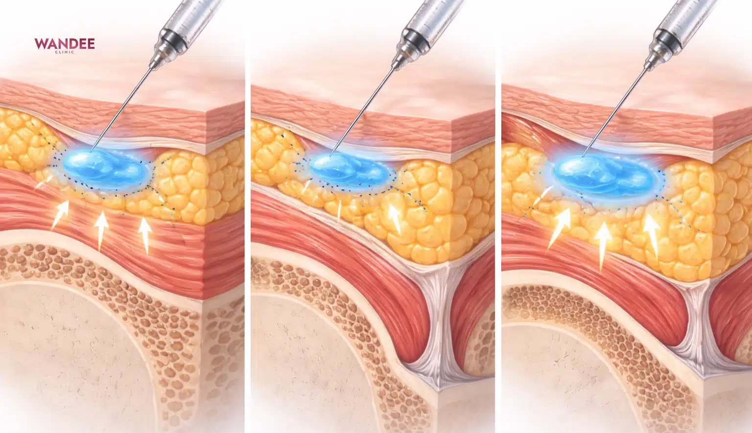 ความต่างสำคัญคือ ฟิลเลอร์ไม่ได้ “เติมแล้วอยู่จุดเดิมแบบก้อน” มันต้องกลืนกับเนื้อเยื่อและกระจายตัวในชั้นที่เหมาะ ถ้าวางตื้นเกินไป คุณอาจเห็นขอบหรือเป็นคลื่น และบางครั้งต้องเพิ่มปริมาณเพื่อกลบเงา