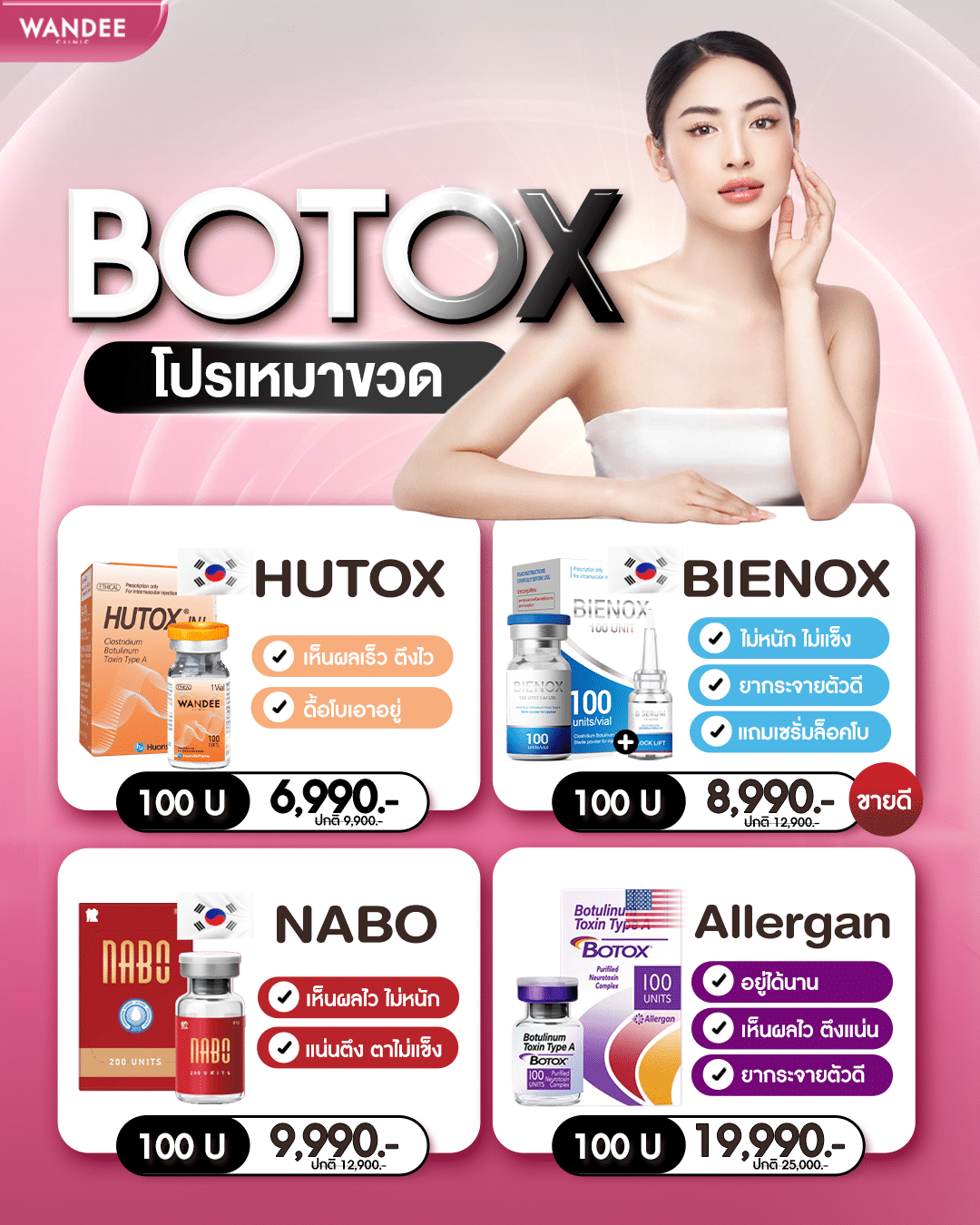 วันดี คลินิก คลินิกความงามใช้โบท็อกซ์แบรนด์ระดับโลก คุณภาพพรีเมียม แพทย์สามารถคาดคะเนการออกฤทธิ์ของตัวยาและวางแผนการฉีดโบท็อกซ์ได้อย่างแม่นยำ สำหรับที่สนใจฉีดโบท็อกซ์ สามารถเข้ามาประเมินปัญหาผิวหรือจองคิว ได้ที่ Wandee Clinic หรือแอดไลน์ @WandeeClinic เพื่อปรึกษาทุกข้อสงสัยเกี่ยวกับโบท็อกซ์ กับผู้เชี่ยวชาญของวันดี คลินิก หรือดูรีวิวโบท็อก เพิ่มเติมได้เลย
