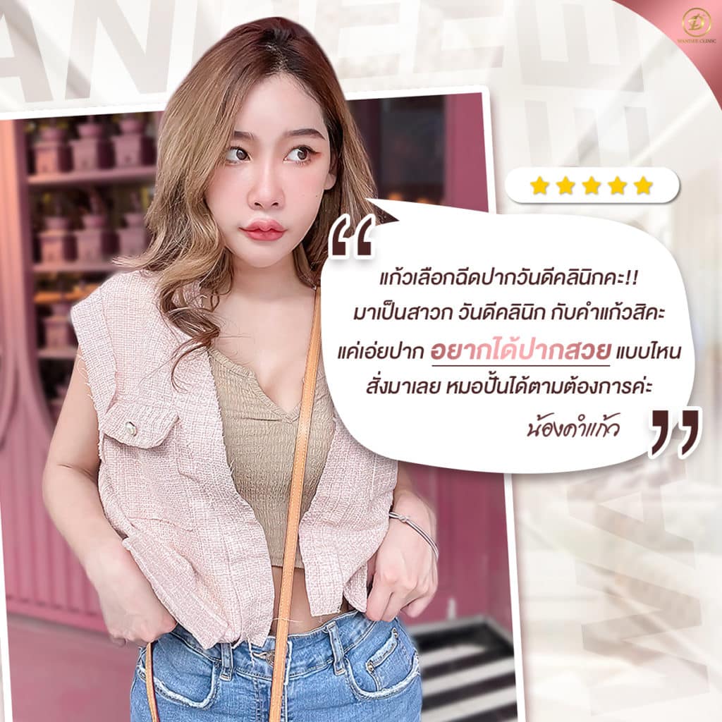 ” ถ้าใครมีปัญหาเดียวกับแก้วนะคะ อย่างเช่น ปากบาง ริมฝีปากเล็ก ดูไม่เต็ม ไม่อวบอิ่ม แนะนำเพื่อนๆ ที่วันดีคลินิกเลยนะคะ ย้ำว่าต้องที่นี่เท่านั้นค่ะ คุณหมอเก่งและ มือเบา มากๆ ค่ะ ปั้นได้สวยตามใจสั่งเลยค่ะ “