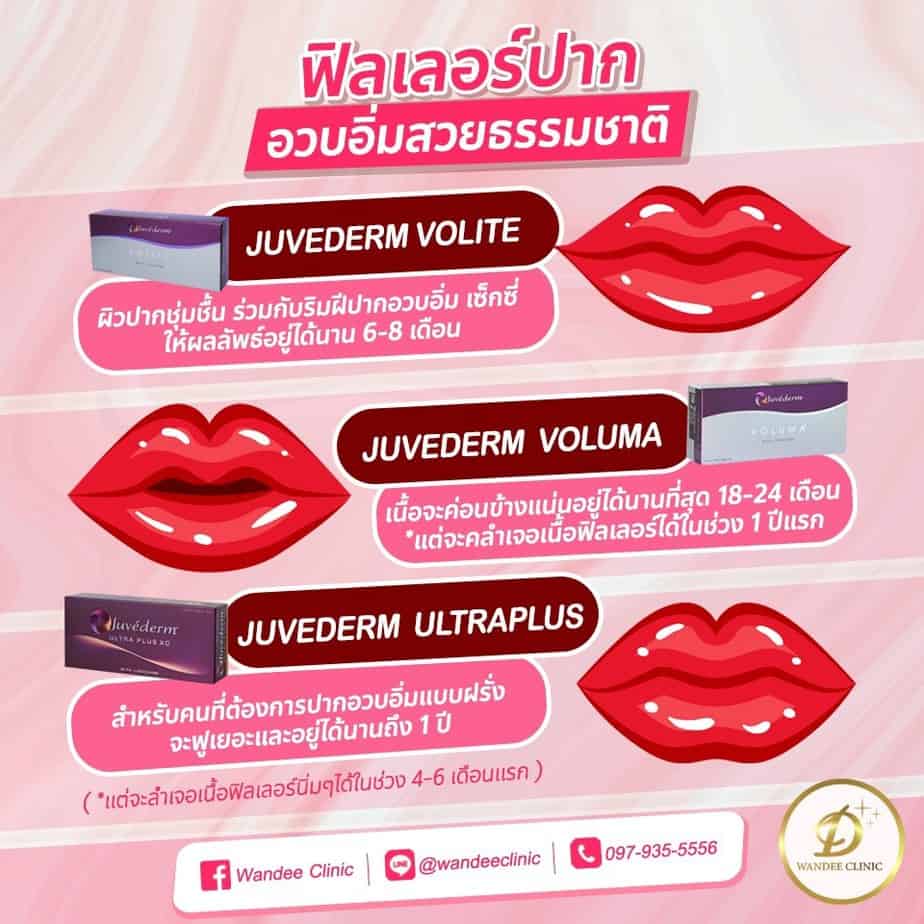 - JUVEDERM ULTRAPLUS สำหรับคนที่ต้องการปากอวบอิ่มแบบฝรั่ง ริมฝีปากจะฟูเยอะ และอยู่ได้นาน 1 ปี