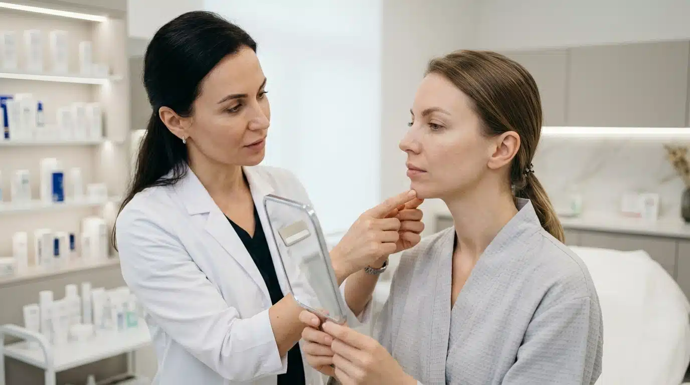 การประเมินคางต้องดูแนวกรอบหน้า ความหนาของเนื้อคางเดิม และแรงดึงของกล้ามเนื้อ mentalis ด้วย เพราะบางคนคางดูสั้นจากการเกร็งกล้ามเนื้อร่วม ไม่ได้เกิดจากกระดูกอย่างเดียว ถ้าประเมินพลาดแล้วเติมหรือเสริมโดยไม่ดู dynamic movement ผลอาจดูไม่ลื่นเวลาพูดหรือยิ้ม