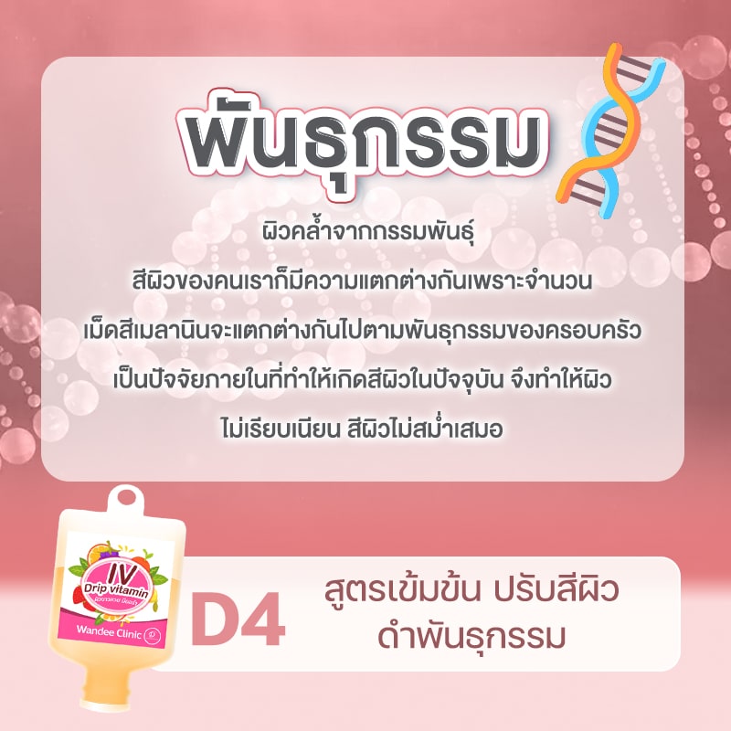 เพราะจำนวนเม็ดสีเมลานินจะแตกต่างกันไปตามพันธุกรรมของครอบครัวเราเป็นปัจจัยภายในทำให้เกิดสีผิวในปัจจุบัน จึงทำให้ผิวไม่เรียบเนียน สีผิวไม่สม่ำเสมอ