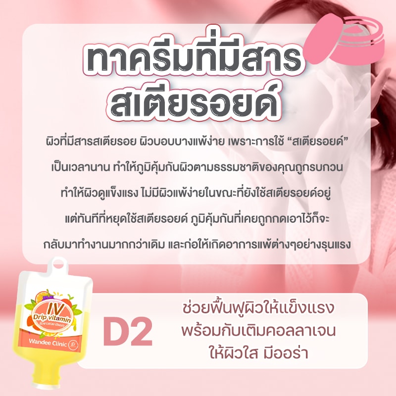 ผิวบอบบางแพ้ง่าย เพราะการใช้ สเตียรอยด์ เป็นเวลานาน ทำให้ภูมิคุ้มกันผิวตามธรรมชาติของคุณถูกรบกวน ทำให้ผิวดูแข็งแรง ไม่มีผิวแพ้ง่ายในขณะที่ยังใช้สเตียรอยด์อยู่ แต่ทันทีที่หยุดใช้สเตียรอยด์ ภูมิคุ้มกันที่เคยถูกกดเอาไว้ก็จะกลับมาทำงานมากกว่าเดิม และก่อให้เกิดอาการแพ้ต่างๆอย่างรุนแรงกับผิว มีการอักเสบบนผิวหนัง