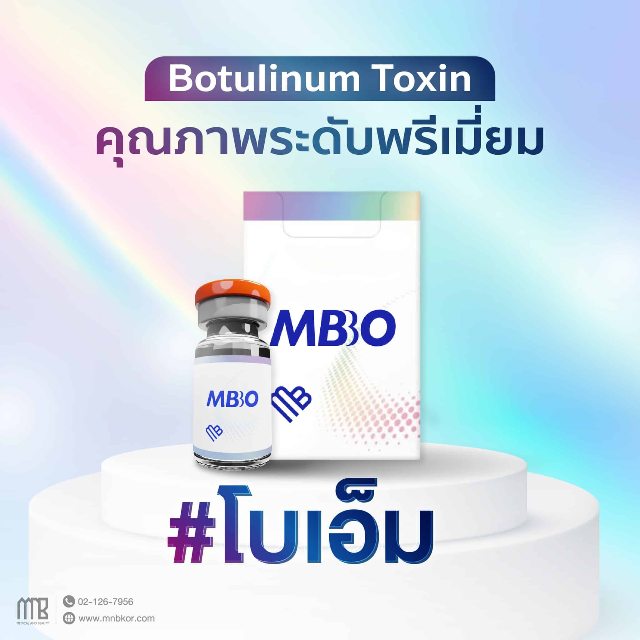 MBTOX Botox หรือที่นิยมเรียกว่า โบเอ็ม เป็น CLOSTRIDIUM BOTULINUM (Toxin Type A) ซึ่งเป็นสายพันธุ์เดียวกับ โบท็อกซ์ Allergan ที่ผลิตโดยบริษัท HUONS BIOPHARMA CO.,LTD. ประเทศเกาหลี ที่มีความบริสุทธิ์สูงถึง 99.8% ช่วยในเรื่องลดริ้วรอยจากการแสดงสีหน้า ริ้วรอยช่วงวัย ช่วยลดความเสี่ยงในการแพ้โบ และลดอาการดื้อโบท็อกซ์ ที่เป็นสาเหตุของการไม่เห็นผลหลังฉีดโบท็อกซ์